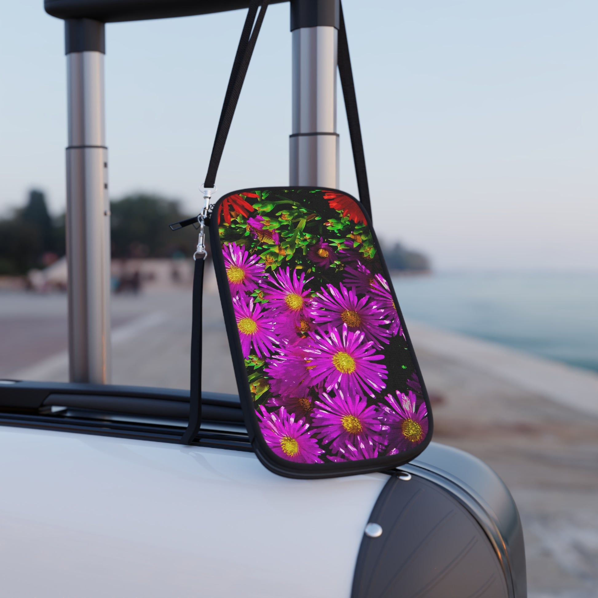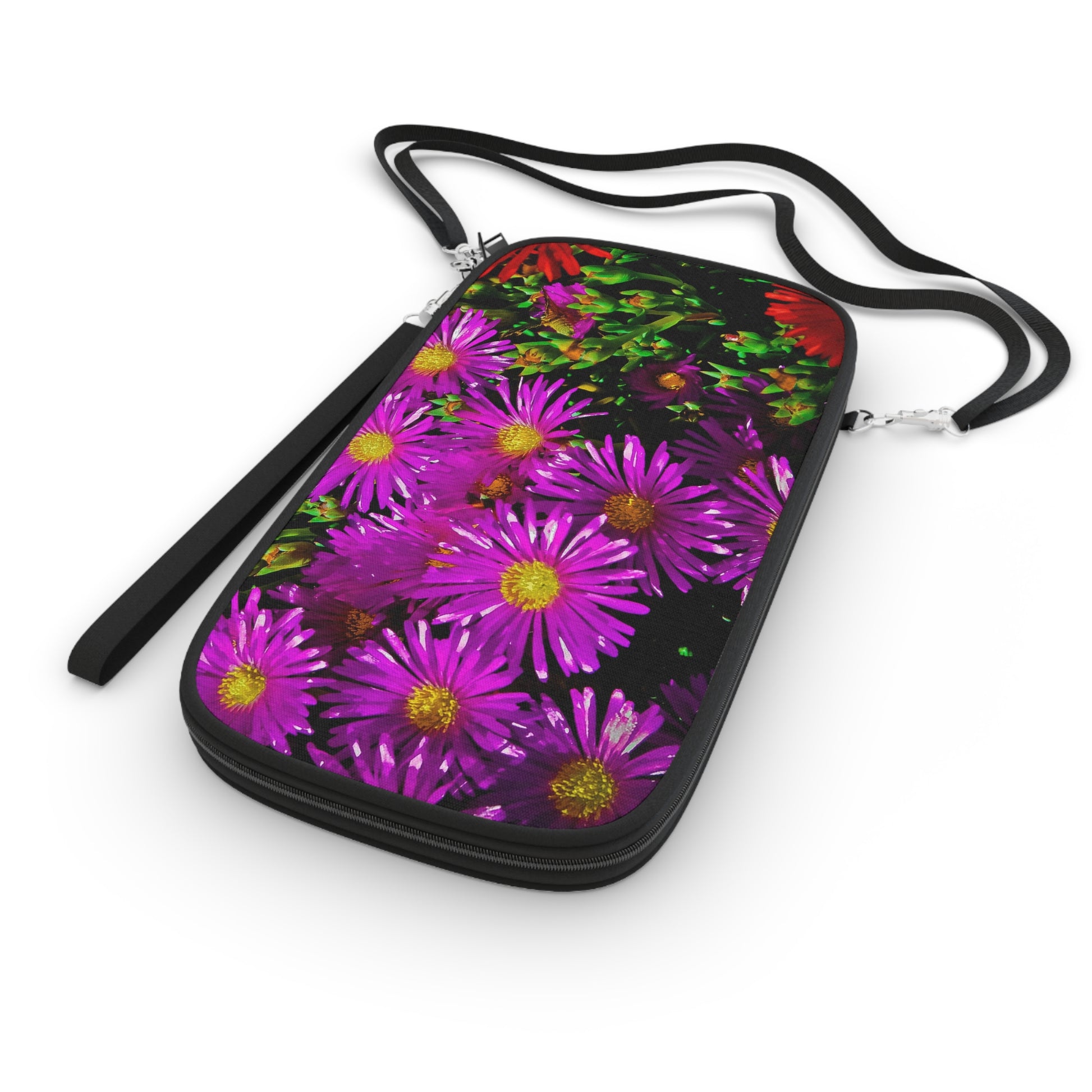 .: Black detachable and adjustable shoulder strap and a black wrist strap